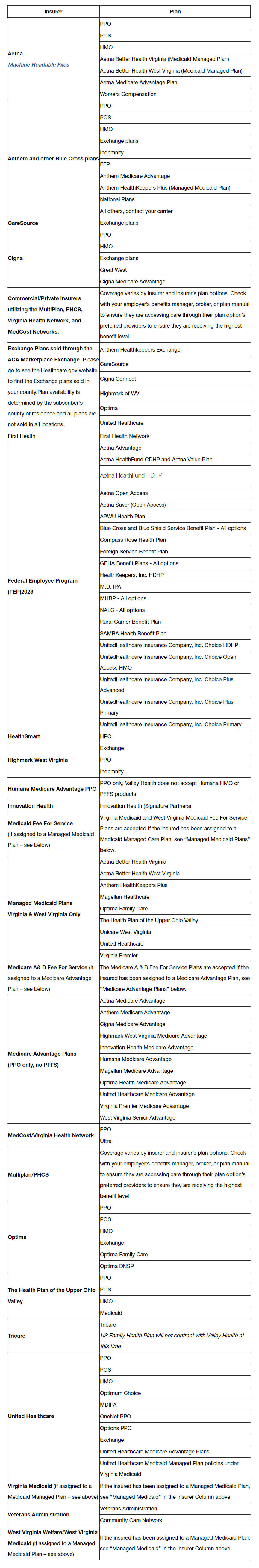 The following list should be considered guidelines only as many insurers offer a wide variety of plan options that may determine, at the individual plan option level, whether or not a patient will be in network with Valley Health providers. Insured individuals should check with their employer’s benefits manager, broker, or plan manual to ensure they are accessing care through their plan option’s preferred providers to ensure they are receiving the highest benefit level. Insurers may require that patients use specific lab services – please check your card or plan manual to ensure you have lab benefits.